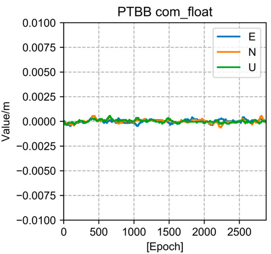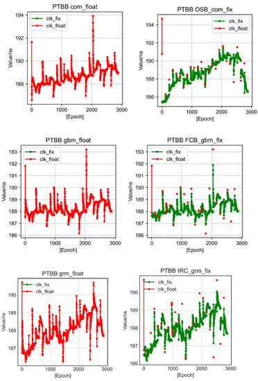 We are aware that there is a strong association between the U direction and clock difference [22]. We assume that the clock difference operates more effectively because the U direction is enhanced. On the basis of this concept, we continue to solve the clock difference result after the ambiguity has been resolved. With 16 stations, it is clear that the ambiguity-fixed method is quite effective at containing those diverging points. In Figure 5, we display PTBB station clock differences of the three techniques (FCB, IRC, and OSB).