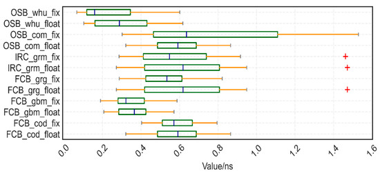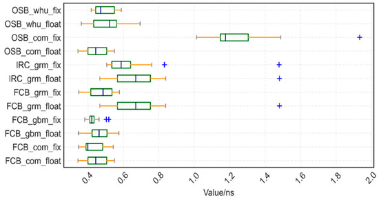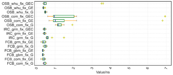We estimated the STD of the time transfer to assess the Type A uncertainty in the remote time-transfer link using the time-transfer results and calculation of station clock difference acquired from the IGS final product as a reference. For a single GPS, the time stability STD of time transfer is enhanced using various ambiguity-fixing procedures, and the improvement ranges from 10 to 40% in the Figure 8 STD box display of 15 time-links. The one with the most improvement, up to 40%, is FCB_grm. OSB_com is the unconventional strategy. In the instance of a single station (Figure 6), one exception has already occurred, and a bigger exception follows the creation of the time connection.