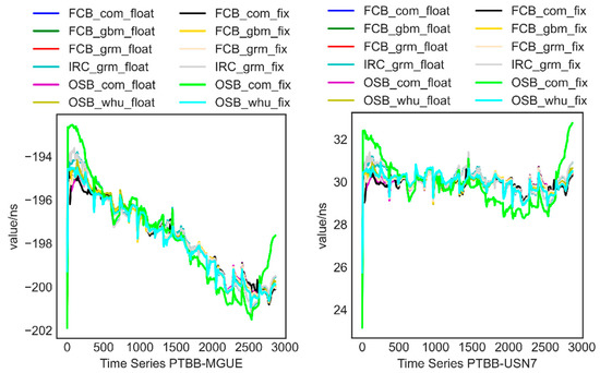 We create the 15 worldwide time comparison connections mentioned above using the PTBB station as the basis. Due to space restrictions, Figure 7 shows the sequence diagrams for the two time-links, PTBB−MGUE and PTBB−USN7. It is clear that the fixed approach, particularly when using WHU goods, has a particular smoothing effect on unfixed.