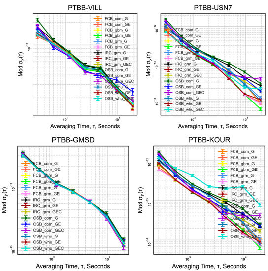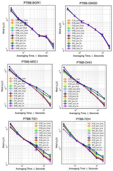 Due to space constraints, we are only able to demonstrate the features of six common time-links (PTBB−BOR1, PTBB−GMSD, PTBB−NRC1, PTBB−OHI3, PTBB−TID1, PTBB−TIDV). Figure 9 makes it clear that the frequency stability of the time link has only slightly improved as a result of the ambiguity-fixed technique. We discovered that between 1000 and 10,000 s, OSB com fix, IRC_ grm_ float, and IRC grm fix all perform poorly.