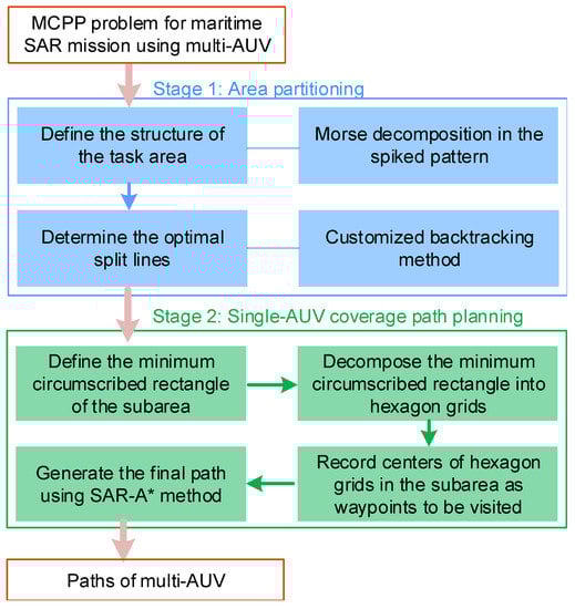 In this section, to solve the MCPP problem for maritime SAR mission using multi-AUV systems, a novel two-stage MCPP method is proposed, consisting of area partitioning and a single-robot coverage path planning. Figure 2 depicts the whole process of the proposed method to clearly show the main framework and the elaborate steps. In the area partitioning stage, the structure of the task area is defined using Morse decomposition of the spike pattern. A customized backtracking method is then proposed, in order to generate the sub-areas. In the single-AUV coverage path planning stage, the minimum circumscribed rectangle sub-area is given first. Then, this minimum circumscribed rectangle sub-area is decomposed into hexagonal cells. Next, the waypoints to be visited are defined as the centers of hexagonal cells within the subareas. Finally, the SAR-A* method is used to determine the final coverage path.