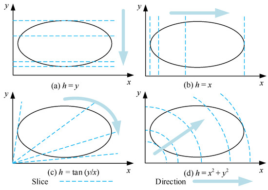 Morse decomposition provides a general framework to define the structure of the task area [35], which is used in existing coverage path planning studies [36,37,38]. The key idea is to scan the task region in different directions using slices of different shapes. Figure 3 shows four examples of Morse decomposition, using different slices and directions. The slices can be treated as split lines to partition the task area. In the case of task areas with special zones, such as obstacles, Morse decomposition is particularly suitable.