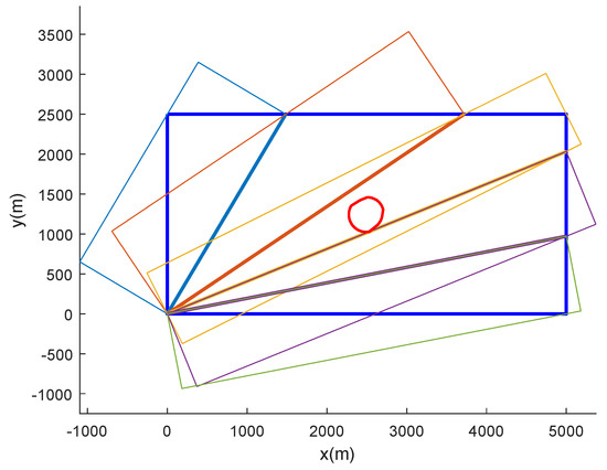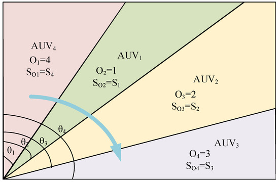 In this part, the optimal deflection angles are solved by changing the order of AUVs. The main idea is to assign the task area according to the expected area of , such that . The minimal is achieved by avoiding the split lines passing the possible target area. The variable conversion subtracts the objective functions , which helps to reduce the computational burden.