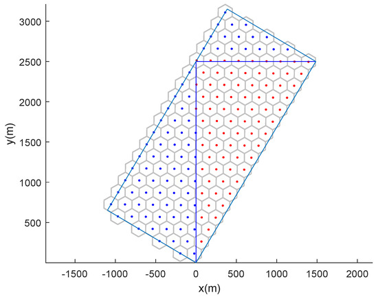 Using the SAR-A* method, the first step is to decompose the task area into hexagonal grids, the centers of which are treated as waypoints. Figure 7 shows a partitioned task area and their minimum circumscribed rectangles. Taking the first sub-area as an example, Figure 8 presents the hexagon decomposition. The hexagonal cells in the sub-area (red points) are retained, and other cells (blue points) are discarded. Thus, sub-area coverage is achieved by visiting all red waypoints within the subarea. The hexagon decomposition has the advantage of allowing for more candidate directions and having equal distances among neighboring grids [44]. If is the width of the SSS, the radius of the hexagonal grid elements should be .