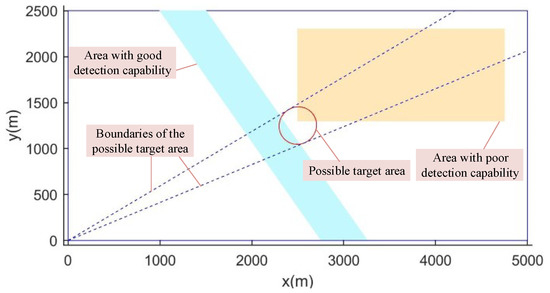 In the simulation part, a rectangular area of 5000 m × 2500 m was to be covered, including regions with different SSS detection capabilities due to inhomogeneous hydrological conditions. As shown in Figure 9, the areas in blue and yellow are those with strong and poor detection capabilities, respectively. The sub-area in the red circle represents a possible target area. The blue dotted lines are the boundaries of the possible target area. Based on the prior target information, the target presence probability distribution is shown in Figure 10.