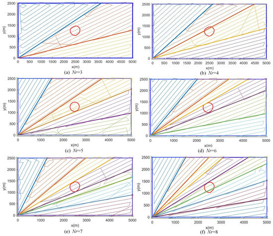 The proposed method has two stages, i.e., area partitioning and single-AUV coverage path planning. For the area partitioning stage, the customized backtracking method is the main computational cost. The upper bound of the computational price of the backtracking method is which occurs for all AUVs’ sequences making the possible target area divided. For the single-AUV coverage path planning, the computation complexity is according to [33], where denotes the number of grids for . Hence, for the whole process of the proposed method, the worst computational load is .