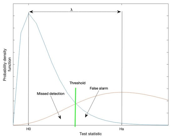 Therefore, the false alarm concept is defined as an indication of positioning failure when this has not occurred. In a similar way, a missed detection event is defined as an indication of positioning failure that has not been detected, which must be minimized as it can lead to fatal events. These hypotheses are tested by comparing the test statistic computed as (10) and a threshold that depends on the probability of false alarm and the degrees of freedom of the distribution, which can be denoted as , being the false alarm rate and p the degrees of freedom. This comparison is known as Global Test (GT) and is used to detect anomalies in the measurements. According to this, as seen in Figure 2, there is a user-defined frontier value of that intersects both curves, which acts as a delimiter to choose between the curves. This threshold value, then, delimits the faulty and non-faulty measurements. In other words, if the test statistic falls below this threshold value, it will be considered a non-faulty observation, while if it falls above the threshold, it will be considered a faulty observation. Note that as the curves in Figure 2 intersect, there are values of the non-faulty distribution that will be considered as faulty and values of the faulty distribution that will be thought of as non-faulty ones. The former case’s probability will be denoted by the probability of a false alarm (), while the latter one will be called the probability of missed detection (). These values can be computed from the graphs integrating the corresponding probability density function (pdf) from zero to the threshold in the case of and from the threshold to infinity in the case of . The threshold, , can be computed as the inverse of a chi-square distribution with degrees of freedom and probability of false alarm :