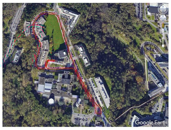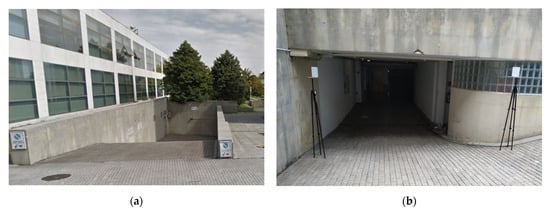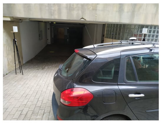 This measurement scenario is located at the technological park of Miramon, San Sebastian, Spain, where a closed-shaped track with indoor and outdoor sections was selected for the campaign (Figure 4). This suburban site is a suitable environment to check the performance of the navigation system, as it contains four different environments with different characteristics within the same measurement: (1) a good-visibility open-sky part, (2) a low-building-density part, (3) a complex urban canyon at the entrance of the garage (Figure 5), and (4) an indoor part inside the garage (Figure 5). The combination of the mentioned areas in the same measurement track allows the analysis of the employed FDE method when applied to sites with different characteristics. Having said this, this study focused on the behavior of the FDE method when applied to UWB-augmented GNSS navigation in urban and indoor environments. Accordingly, the UWB anchors have only been located at the entrance of the garage and in the indoor environment inside the garage.