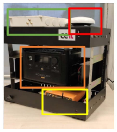 Employed measurement system (red: GNSS antenna; green: navigation system; orange: power supply; yellow: ground truth generating system).