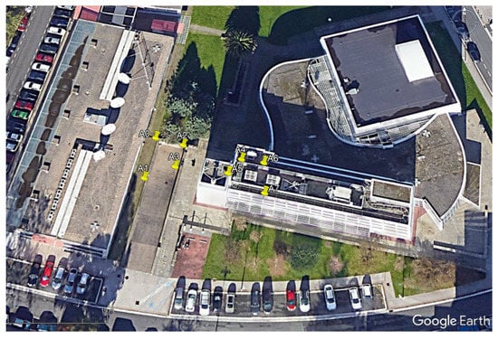 Moreover, eight UWB anchors were placed within the limits of the garage, as shown in Figure 8, to cover all the areas in which the car could go through. The UWB anchors outside the garage (A0 to A3) were located with the same Septentrio GNSS system, applying Real-Time-Kinematics (RTK) corrections to the positioning algorithm, in order to obtain centimeter-level accuracy. The anchors inside the garage (A4 to A7) were located according to a local-frame X–Y–Z coordinate system, which origin was referenced to anchor A0. Moreover, the computation of the position of anchors A4 to A7 was performed by means of rotating the mentioned relative local X–Y–Z coordinates to East–North–Up (ENU) coordinates for a later translation to ECEF absolute coordinates. Note that any position error introduced in the reference A0 anchor’s coordinates would directly translate to the coordinates of anchors A4 to A7. Accordingly, the RTK algorithm was allowed to converge over 15 min, in order to obtain centimeter-level accuracy.