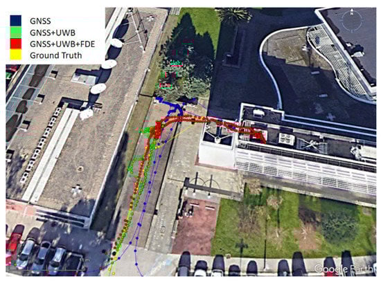 Furthermore, it is meaningful to mention that in the part of the track in which UWB was not used or, what is to say, the part outside the entrance of the garage, the results of the GNSS and UWB fusions with and without applying the FDE method performed almost identically. Note that, after losing the coverage of the UWB anchors, the GNSS + UWB and GNSS + UWB + FDE solutions need some time to converge to the same standalone GNSS solution.