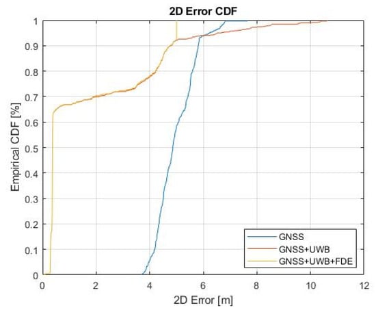 Moreover, not only does Figure 10 show the overall improvement of the UWB-augmented GNSS system against the standalone GNSS navigation, but it also shows that the degradation in performance of said sensor fusion is caused by incorrect UWB signal couplings or uncouplings, which are modelled as biased observables, thus, excluded by the FDE methods. Accordingly, the maximum positioning error is decreased, improving the behavior of the CDF that corresponds to GNSS + UWB + FDE with respect to the one corresponding to GNSS + UWB.