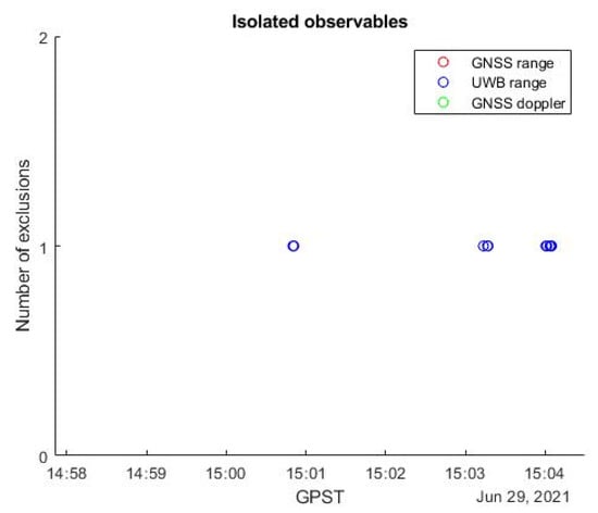 Moreover, as shown in Figure 9, the result at the beginning of the track of the GNSS + UWB and GNSS + UWB + FDE methods are almost identical, being both of them much closer to the ground truth than the GNSS-only one, which showed an initial offset of about 4 m from the reference (see Figure 10). The cause of this is that the convergence time at the beginning of the measurement allows the algorithm to make use of UWB’s accuracy to obtain an accurate initial position. Moreover, the similarity between the GNSS + UWB and GNSS + UWB + FDE methods can be confirmed by the number of excluded observables at the beginning of the measurement; which can be seen in Figure 11. It can be seen that the only observables that are excluded are the UWB ones due to two main reasons. The first one, as commented in the introduction of this document, is related to the elevation mask applied to the satellites in view which, as it is set to be higher than 40º, reduces the probability of employing multipath or NLOS-containing satellite pseudoranges. The second one is caused by the high confidence value that is assigned to UWB ranges by the measurement covariance matrix, , due to their lower noise Power Spectral Density (PSD). This high confidence also implies higher visibility at the time of fault detection, making them easier to be detected, as expected.