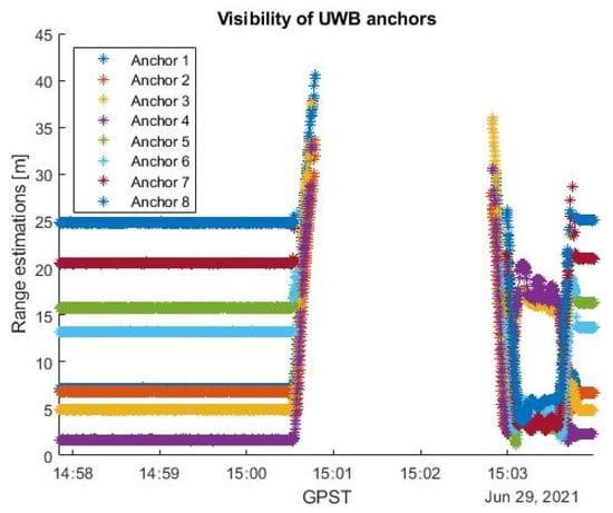 It is only when the vehicle starts its mission that the UWB range estimations began to change their values and disappear due to the lack of LOS of NLOS signals that the first excluded observable can be seen in Figure 11. This excluded range from anchor 5 is caused by the lack of LOS component in the received signal before it disappeared at the same time that the vehicle abandoned the UWB coverage area.