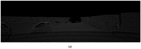 The pipeline is illustrated in Figure 3 for the inputs of Figure 4. Before using it, the camera intrinsic [28] and camera–LIDAR (extrinsic) [29] calibration should be executed. The depth images containing values are determined using the LIDAR–camera transformation and intrinsic matrix. For better visualization, the LIDAR depth measurements are converted to disparity image and illustrated here ( with b baseline and f focal length).