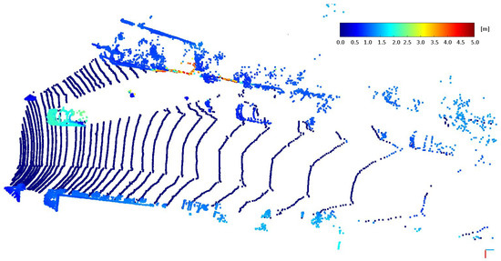where the upper index i indicates the point of the point cloud and represents ground points in the point cloud . The above equation means that scene flow is only applied for non-ground points (as it is visible in the case of Figure 6). As 3D scene flow is estimated for each point, movement estimation of moving objects is included in the pipeline and we do not have to consider them separately. All the points of static objects should have the same scene flow value (the ego-motion vector in opposite direction), and points of a dynamic object should have some other value (same for the same objects). The resulting point cloud is illustrated in Figure 7. The appropriate estimation of static and moving objects can be observed in Figure 7, where approaching vehicle points have about 2 m estimated displacement. In comparison, static environment points (including parking cars) have a roughly 1 m estimated displacement.