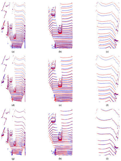 Example 3. Illustration of generated clouds with different methods together with the ground truth (blue—virtual measurement, red—ground truth measurement). (a) Example cloud with baseline [27];(b) enlarged details 1 [27]; (c) enlarged details 2 [27]; (d) example cloud with [8]; (e) enlarged details 1 with [8]; (f) enlarged details 2 with [8]; (g) example cloud with the proposal; (h) enlarged details 1—proposed; (i) enlarged details 2—proposed.