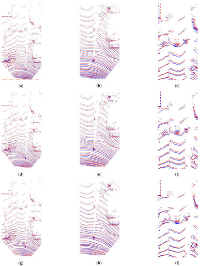 Example 2. Illustration of generated clouds with different methods together with the ground truth (blue—virtual measurement, red—ground truth measurement). (a) Example cloud with baseline [27]; (b) enlarged details 1 [27]; (c) enlarged details 2 [27]; (d) example cloud with [8]; (e) enlarged details 1 with [8]; (f) enlarged details 2 with [8]; (g) example cloud with the proposal; (h) enlarged details 1—proposed; (i) enlarged details 2—proposed.