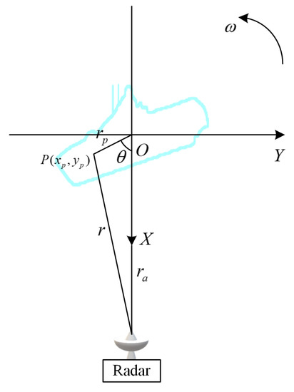 Ideally, there is only rotation after the motion compensation between the radar and target, as shown in Figure 1. The target rotates with the center point O and the distance to radar is . Let the x-axis be the Line of Sight (LOS), and a scatterer P coordinate be (). The distance to O is , and the distance to the radar is r. The angle between the OP and the positive direction of the x-axis is . As , we have