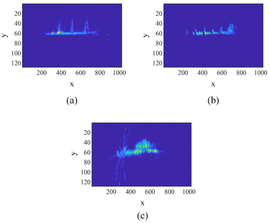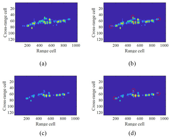 The first step is preprocessing the ISAR images. The ISAR target is composed of a few extremely strong scatterers and many weak scatterers. In order to reduce its dynamic range, it is necessary to use decibel mapping, which involves taking the logarithm of the amplitude of the ISAR image to change its amplitude to dB. Next, threshold processing is needed. Although the scatterers are different in amplitude, they typically have more noticeable grayscale distribution differences compared to the background. Therefore, global thresholding can be considered for preprocessing. However, the fixed thresholding is not satisfied with the ISAR image, so automatic threshold estimation is performed for each image, and a common iterative algorithm is used [34].
