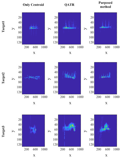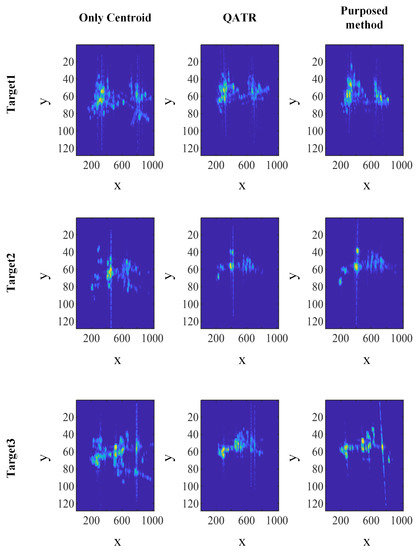 As this paper calculated the correlation between the test data and the templates to recognize ISAR images, the accuracy reflects the similarity of images after reconstruction. If the test data are similar to the templates, this means that the reconstruction process effectively reduces the influence of attitude sensitivity. Therefore, the recognition accuracy reflects the robustness of the reconstruction algorithm. The “only centroid” method only translates the ISAR images to the center, and the different images are uncorrelated, as influenced by the rotation. Therefore, the accuracy is the lowest. As with the proposed method, QATR also affines the image. However, the matching pairs of feature points are not accurate, which is influenced by the noise, strips, and angle glint, leading to rotated reconstructions that differ from the templates. The correlation between rotated images is lower, resulting in lower accuracy. The proposed method has the best robustness among these methods, and can adjust the images with different attitudes, resulting in the highest accuracy. which further proves the effectiveness of the proposed algorithm. In the future, we will focus on the effect of TP-TATR on more types of ships and different noise levels.