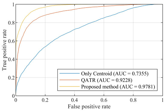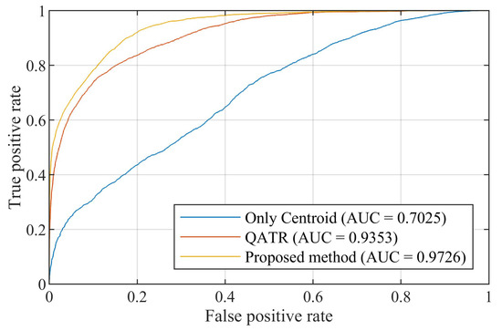 Consistent with the results of simulated data, the “only centroid” method has the worst recognition capability, with its curve closest to the diagonal line and the lowest AUC at 0.7025. The QATR is in the middle, with both its curve and AUC at 0.9353. The best is our proposed method, with the curve closest to the top-left corner and the highest AUC at 0.9726.