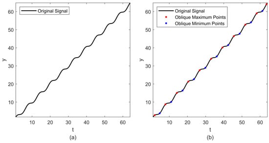 As shown in Figure 2a, obviously, the signal is strictly monotonically increasing, without any extremum points. However, intuitively, there indeed exist some special signatures in this signal. To address this problem, Yang et al. [25] defined the oblique extremum points to characterize these special points and proposed an approach to detect them.