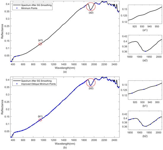 Let’s consider the spectral data of a measured soil sample after SG smoothing as an example, to further illustrate the difference between the extremum method and the improved oblique extremum method for extracting the indicative signatures. As shown in Figure 3a, for the extremum method, only 30 local minimum points—also known as the absorption points—were extracted, with no local minimum points detected in 600–1700 nm. In other words, almost all the absorption signatures are located on either side of the signal. However, with the improved oblique extremum method, 133 points that covered the entire wavelength of the signal are extracted totally. Clearly, the extracted results of the improved oblique extremum method reflect more information and detail about the signal than the extremum method does. Moreover, the improved oblique extremum method has the ability to extract potential weak absorption points in the spectral data. The comparative details are all demonstrated in Figure 3.