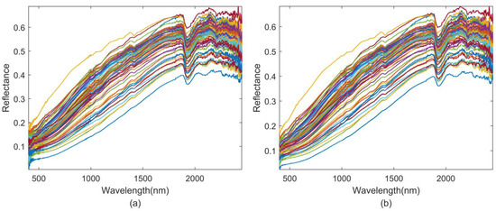 Spectral reflectance of 68 samples. (a) The original spectra; (b) SG smoothing results.
