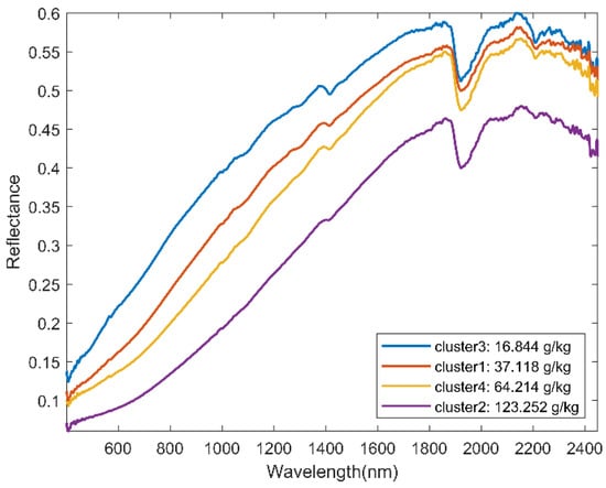 To gain a deeper understanding of the spectral characteristics and investigate the relationship between soil reflection spectra and SOM content, all the 68 samples were clustered into four classes using the K-means clustering method [28] (Figure 5). The number of the classes was determined with the Elbow method [29]. Based on Figure 5, it is apparent that there exists a negative correlation between soil spectral reflectance and SOM content, meaning that the higher the SOM content, the lower the spectral reflectance. Obviously, the significant absorption features are located near 1400 nm and 1900 nm, primarily due to the stretching vibration of hydroxyl and the bending vibration of Al-OH of the water molecules [12,30,31]. These features are also caused by the water vapor in the air during the laboratory spectroscopy measurements. Additionally, an absorption close to 2200 nm, a characteristic of kaolinite, can also be observed, resulting from the combination of Al-OH bend and O-H stretch [32].