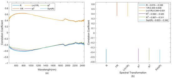 The correlation coefficients between the SOM contents of the samples and their spectral reflectance, as well as their five spectral transformations (, , , , and ), were calculated and illustrated in Figure 6. There is a strong negative correlation between the SOM contents and the original spectral reflectance within the range of 401–2450 nm, which is consistent with the findings of the clustering analysis discussed in Section 3.1. Regarding the five spectral transformations, , , and coincide with the original spectral reflectance , whereas the transformations and exhibit a mirror symmetry, as depicted in Figure 6a. From Figure 6, it can be observed that: (1) the coefficients between the original spectral reflectance and SOM contents fall within the range of [−0.615, −0.336]; and (2) the transformations , , and can marginally improve the correlation between the original spectral reflectance and the SOM content.