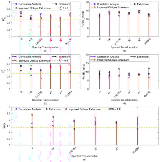 The performance comparison of the optimal models for six transformations with different indicative signature extraction methods are demonstrated in Figure 7. The results show that, on the whole, models based on indicative signatures extracted through the improved oblique extremum method outperform both correlation analysis and extremum methods; they have higher , lower RMSE, and higher RPD. These results reveal the fact that the improved oblique extremum method is capable of detecting the possible weak indicative signatures in the spectral data, which were hidden as the oblique minimum points rather than local minimum points. Further, these weak indicative signatures are of great importance in subsequent retrieval processes.