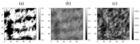 Images captured through UAV and multispectral cameras of different bands in a 1.0 m × 1.0 m area: (a) green, (b) NIR (near-infrared), and (c) red. The legend represents reflectance values.