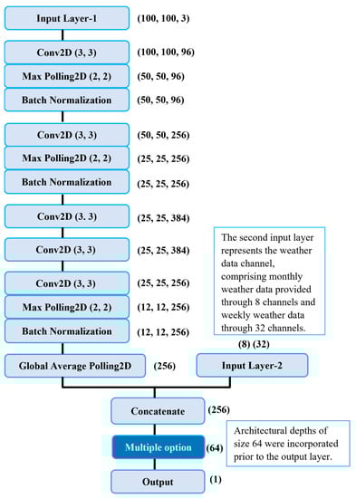 The AlexNet architecture-based CNN model with weather data. The numbers next to the boxes are the output shapes of the indicated layers.