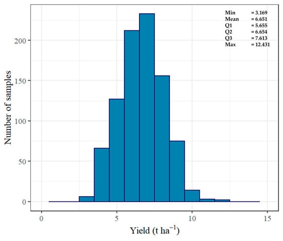 A histogram of the yield data is shown in Figure 6. The collected data showed an approximately normal distribution, although there were a few extremely high-yield observations (>10 t ha−1, n = 894). The mean value was 6.65 t ha−1, and the standard deviation was 1.46 t ha−1 (coefficient of variation: 22.0%).