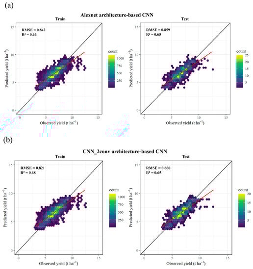 The performance of each model estimating the rice yield is presented in Table 4. Excluding the AlexNet models with no weather data (Models 1–3), the other models had high RMSE values when the layer depth was 0. The computational time required for prediction was approximately eight times longer in the AlexNet feature extractors than in the CNN_2conv ones. The top two accurate models with the lowest RMSE values were found in models integrating weekly weather data as input data with either AlexNet (Model 8) or CNN_2conv (Model 18). The relationships between the observed and predicted rice yields of the most accurate models, based on the AlexNet and CNN_2conv architecture-based models, are shown in Figure 7. There were no clear differences in the relationships between the observed and predicted yields when the AlexNet and CNN_2conv architecture-based models were compared.