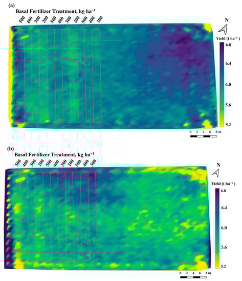 Yield prediction maps of a surveyed field based on (a) Model 8 and (b) Model 18.