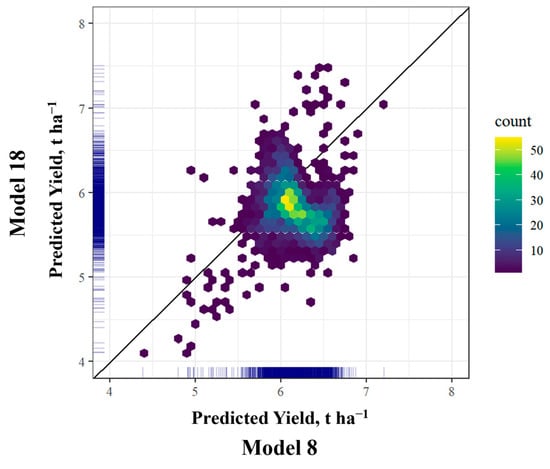 Scatter plot of predicted yield by Model 8 vs. Model 18 for a selected field (Field ID: 15). The red line indicates the 1:1 line.