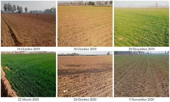 The study area was located in Xiangfu District (Lat 34°36′–34°51′N, Lon 114°30′–114°45′E), Kaifeng city, Henan Province, China, which covered an area of approximately 500 km2, as shown in Figure 1. The region had a temperate continental monsoon climate and was part of the North China Plain. The climate was ideal for agricultural growth, with an average yearly temperature of about 14 °C and 628 mm of precipitation. The farmland in the research region was mainly planted with winter wheat and corn, and a crop rotation pattern of winter wheat and summer corn was implemented. Winter wheat was generally planted in October and harvested in June of the following year. Four different phenological stages of winter wheat, including the emergence stage, tillering stage, overwintering stage, and standing stage, were selected for SSM inversion during two annual growth cycles of winter wheat, which were 2019–2020 and 2020–2021 cycles.