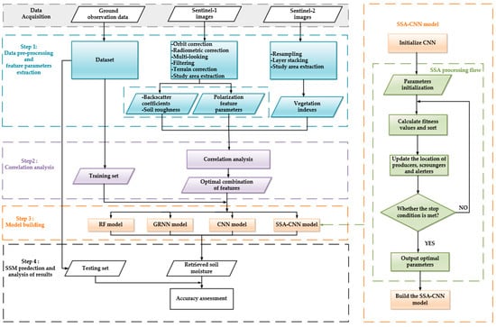 The flow chart of the method used in this paper is shown in Figure 3. After data collection, the SSM inversion method proposed in this paper was mainly divided into 3 steps. Firstly, the feature parameters and vegetation indexes were extracted from Sentinel-1 SAR data and Sentinel-2 optical data after pre-processing, respectively. Secondly, correlation coefficient and mutual information (MI) methods were used to analyze the correlation between the extracted feature parameters and field measured SSM data to obtain the optimal combination of feature parameters. Then, the optimal combination of CNN hyper-parameters was obtained by using SSA algorithm and used to build the SSA-CNN model for SSM inversion of winter wheat covered farmlands. Finally, to demonstrate the effectiveness of the proposed SSA-CNN model, three typical machine learning models, including random forest (RF), GRNN, and CNN, were established for comparison experiments, and the regional SSM values of the study area were retrieved during 4 winter wheat phenological periods.