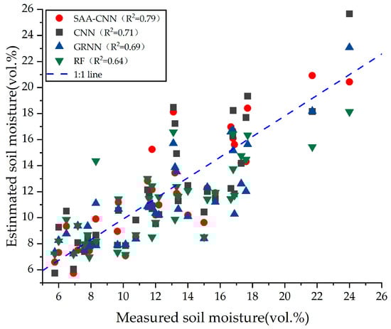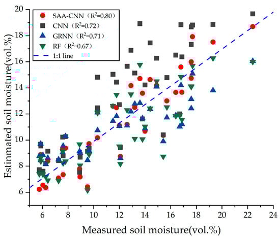 - The SSA-CNN model was established and compared with RF, GRNN, and CNN models to validate its effectiveness. Among the four models, the proposed SSA-CNN model had a higher inversion accuracy. Its average , average RMSE, and average MAE were 0.80, 2.17 vol.%, and 1.68 vol.%, respectively.