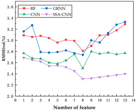 The optimal size of the feature parameter subset used as the input data of the subsequent four models was explored in this study. The number of the used feature parameters was gradually increased to use in the four models, according to the correlation ranking of the feature parameters. First, only the top feature parameter with the highest relevance ranking was used as input data to build the four models. Then, the four models were constructed using the top two feature parameters in the correlation ranking. Finally, the number of the used feature parameters was gradually increased until all of them were used to build the four models. The result is shown in Figure 7. As can be seen in Figure 7, there was a general trend in decreasing and then increasing of the RMSEs of the four models with the increase in the number of the used feature parameters. In other words, a general trend in increasing and then decreasing of the estimation accuracy of the four models was shown with the increase in the number of feature parameters. Although the fluctuations of the four models were not the same, it was demonstrated that the trough of the RMSE curve, which meant the highest estimation accuracy, occurred when the top eight feature parameters in the correlation ranking were used in the four models. When the number of the used feature parameters was greater than eight, the accuracy of the four models on the testing set would decrease. The above results showed that redundant feature parameters could negatively affect the fitting performance of the models to some extent. Therefore, correlation analysis before conducting models was important to eliminate redundant feature parameters and effectively improve the inversion accuracy. In addition, it was also shown in Figure 7 that the SSA-CNN model proposed in this paper had the least fluctuation in accuracy and was more stable among the four models, which further demonstrated its better performance.