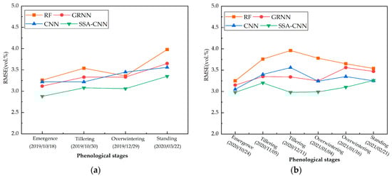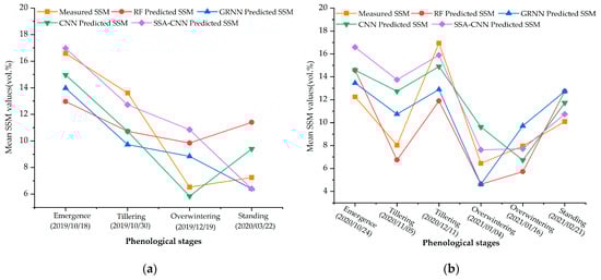 The dynamic change in the average SSM in the winter wheat growing period is shown in Figure 8. The average SSM values in the emergence stage, tillering stage, overwintering stage, and standing stage of the winter wheat growing periods in 2019–2020 and 2021–2021 are represented in Figure 8a,b, respectively. On the whole, it is demonstrated in Figure 8a that a decreasing trend in the average SSM was shown from the emergence stage to the overwintering stage of the winter wheat. As sufficient soil moisture content was necessary to ensure the emergence rate of winter wheat, much irrigation usually occurred during the emergence period. With the growth of wheat seedlings and the evaporation of SSM, the soil water consumption increased, and, therefore, the average SSM decreased gradually. During the standing stage of winter wheat, a slight increase in the average SSM was shown compared with that of the overwintering stage, mainly because the temperature gradually rose, and the growth rate of wheat seedlings was accelerated during the standing stage. It should be pointed out that there was an evident ascent of the average filed measured SSM during the tillering stage in Figure 8b because it rained in the study area on the day before the field survey on 11 December 2020. The trend in the average SSM during the remaining phenological stages in Figure 8b was similar to that in Figure 8a. Overall, these four models tracked the dynamic changes in SSM well, and the proposed SSA-CNN model showed better performance than the other three models.