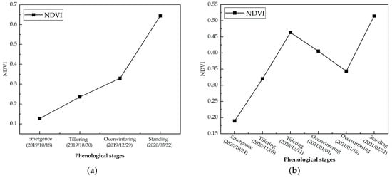 Dynamics of the mean NDVI of the winter wheat sampling sites: (a) 2019/10/18–2020/03/22; (b) 2020/10/24–2021/02/21.