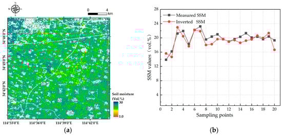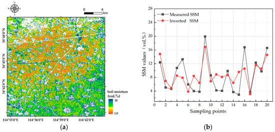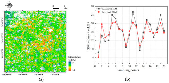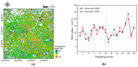 Inversion results for 29 December 2019: (a) Inversion results of the regional SSM in the study area; (b) Differences of the measured and retrieved SSM values at 20 reference plots.