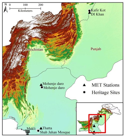 To frame these recent events within the wider picture of global drivers, it must be noted that changes in temperature and precipitation are among the climatic factors identified by the United Nations Educational, Scientific and Cultural Organization (UNESCO) that pose threats to conservation of heritage sites [22]. In the context of climatic stressors and consequent risk that exacerbate exposure of cultural heritage, preservation of heritage sites of universal value and the determination of such risks threatening those unique values due to climate change are a significant challenge that heritage site managers are facing [23,24]. The vulnerability of cultural heritage sites has gained much attention worldwide as emphasized by the UNESCO policy document in 2008 [25]. However, from global to regional-local level, the current state of knowledge and implementation scenario may be very uneven. With specific regard to Pakistan, to the best of our knowledge, no systematic studies reporting the assessment of impacts of climatic change on cultural heritage sites have been conducted so far.