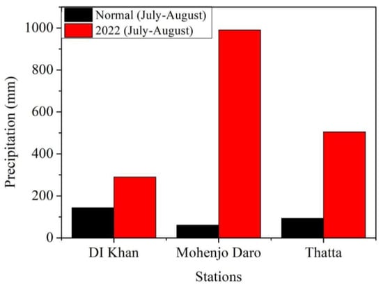 The geographic variable regards the selection of archaeological sites and monuments in those regions that were mostly affected by the 2022 summer floods and, as such, are representative of flood-prone sites. According to PDNA (2022) and the ICIMOD report [18,21] (see Section 1.2), Sindh and Khyber Pakhtunkhwa were the most affected regions. In particular, the rainfall records measured near three of the selected sites (see locations of the meteorological stations in Figure 1 and the rainfall data in Figure 2) was exceptionally high by 20-fold and 16-fold in July and August 2022. In DI Khan meteorological station, the rainfall was double the normal, but the situation was worse due to flash floods from the adjacent hill torrents in the west. The comparison of rainfall data between normal seasons and the 2022 floods is shown in Figure 2.