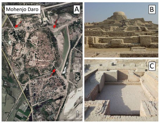 The archaeological site of Mohenjo Daro is the best-preserved urban settlement in today’s Sindh province of Pakistan (Figure 3A–C). Located on the right bank of the Indus River, 510 km north-east from Karachi, the site prospered between the beginning of the 3rd millennium BCE and the first half of the 2nd millennium BCE, representing a major centre of the Indus valley or Harappan civilization [32,33].