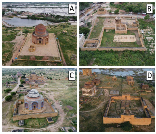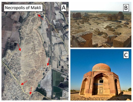 Makli is among the largest necropolises in the world (Figure 4A–C). Located in the southern province of Sindh, it includes an enormous cemetery with half a million tombs and graves in an area of about 10 km2 [45]. This cemetery served the historical Mughal capital of Thatta (located 6 km away from it) which flourished between the 14th and 18th centuries CE. Among others, the necropolis features several large funerary monuments (Figure 4B,C) belonging to kings, Sufi saints and scholars [46].