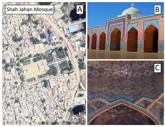 The Shah Jahan mosque in Thatta: (A) satellite image showing the mosque (Google Earth, 14 September 2022); (B,C) overview and details of the monuments (photo by the authors).